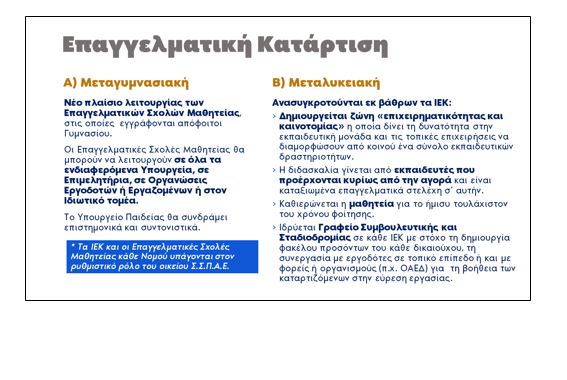 - Στο σχέδιο νόμου με τίτλο «Αναβάθμιση του Σχολείου και άλλες διατάξεις», δεν γίνεται καμία αναφορά για «Ίδρυση πρότυπων Επαγγελματικών Λυκείων».