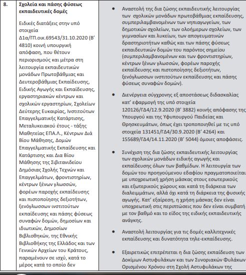 Η τηλεκπαίδευση θα συνεχίσει μέχρι τις 13 Δεκεμβρίου, ενώ από αναστολή της δια ζώσης εκπαίδευσης εξαιρούνται τα σχολεία Ειδικής Αγωγής και Εκπαίδευσης όλων των βαθμίδων.