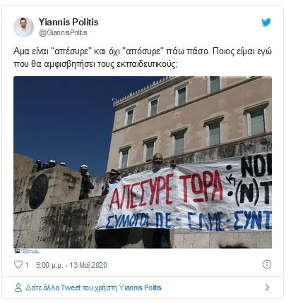 Αρκετοί ήταν αυτοί που πρόσεξαν το πανό που αναρτήθηκε χθες έξω από το Κοινοβούλιο κατά τη διάρκεια της διαμαρτυρίας των εκπαιδευτικών για το νομοσχέδιο του Υπ. Παιδείας και έδινε με εμφατικό τόνο συγκεκριμένη… προσταγή στην υπουργό Παιδείας. {ad} «Απέσυρε τώρα» το νομοσχέδιο έγραφε το πανό, με τον συντάκτη να αγνοεί προφανώς ότι το πανό θα […]
