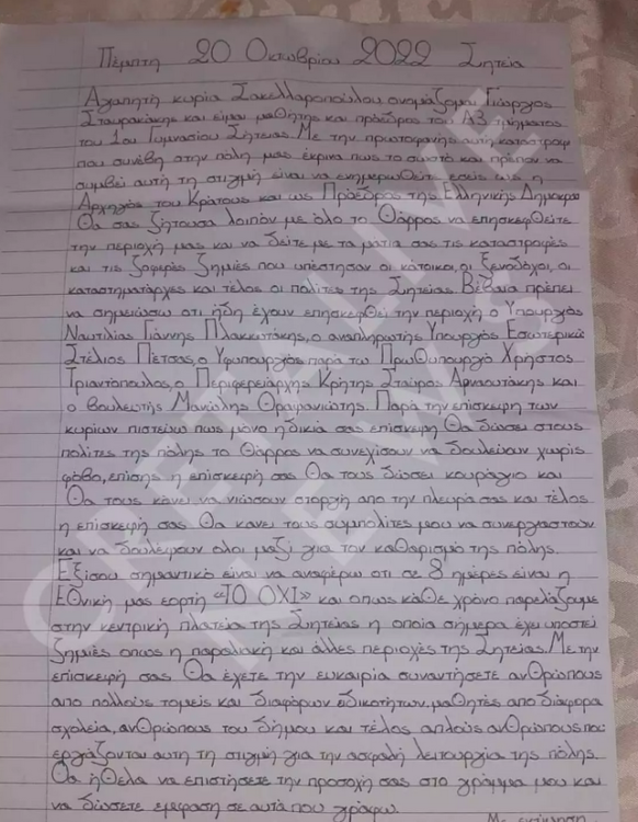 Λίγες ημέρες μετά τις καταστροφικές πλημμύρες στη Σητεία, ένας 13χρονος μαθητής της Α’ Γυμνασίου, παίρνει την πρωτοβουλία να γράψει μια επιστολή στην Πρόεδρο της Δημοκρατίας, Κατερίνα Σακελλαροπούλου, προσκαλώντας την να επισκεφθεί την πόλη του και τους κατοίκους της, για να διαπιστώσει από κοντά το μέγεθος της καταστροφής.