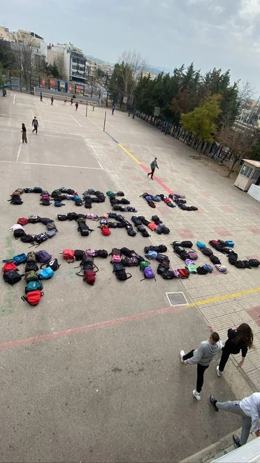 «Πάρε με όταν φτάσεις» σχημάτισαν με τις τσάντες τους, μαθητές του Πρώτου Γυμνασίου Αγίων Αναργύρων, εκφράζοντας τη θλίψης τους, για το σιδηροδρομικό δυστύχημα των Τεμπών, που μέχρι στιγμής, έχει «κοστίζει» τη ζωή, σε 46 συνανθρώπους μας.