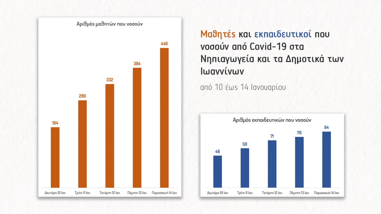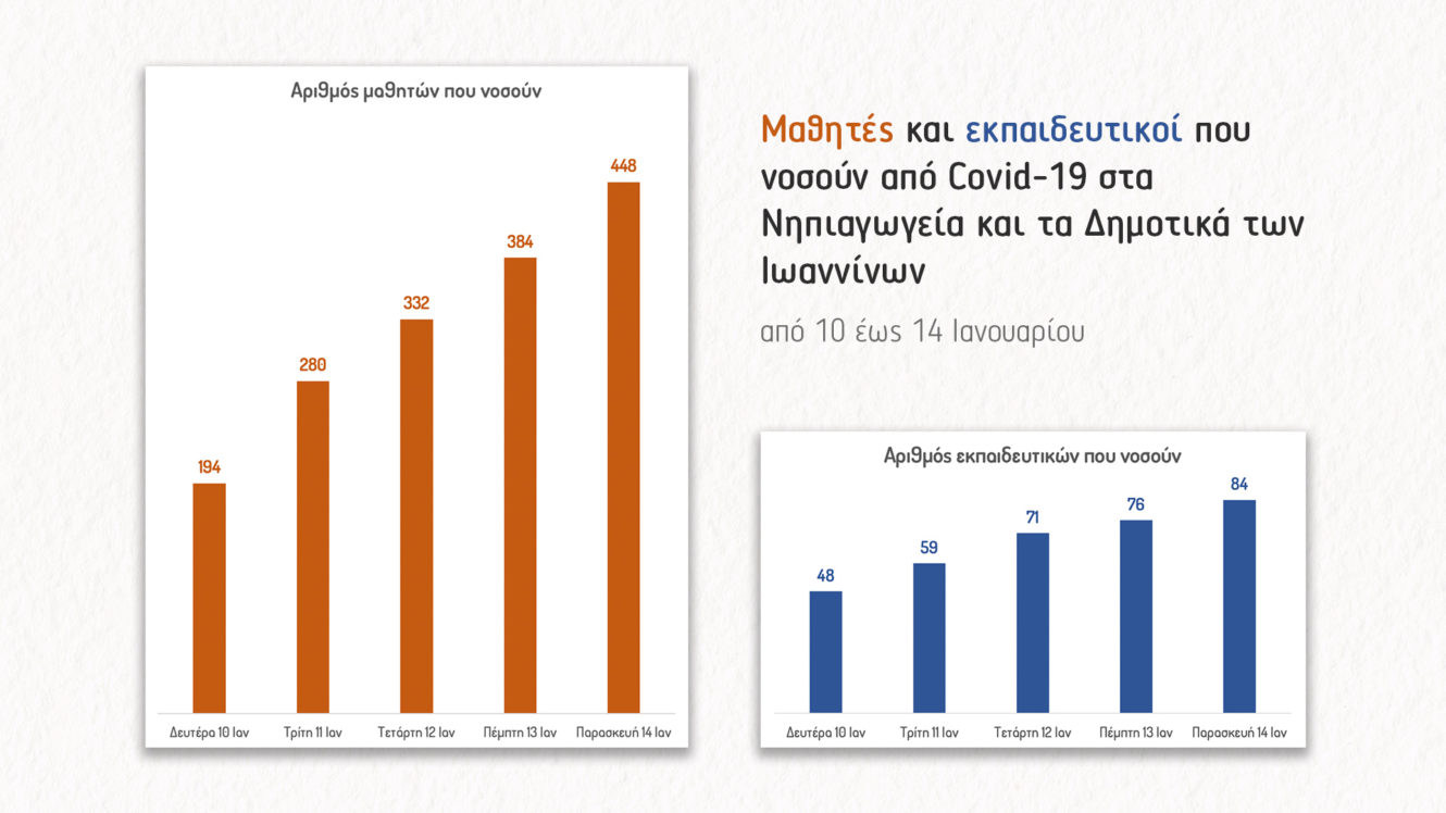 Εκατοντάδες ήταν τα κρούσματα σε μαθητές και εκπαιδευτικούς των Νηπιαγωγείων και των Δημοτικών στα Ιωάννινα, την πρώτη εβδομάδα επαναλειτουργίας των σχολείων. Κυβέρνηση και υπουργείο Παιδείας εφαρμόζουν το σχέδιο «ανοσία της αγέλης στα θρανία», αδιαφορώντας για τον υγειονομικό αντίκτυπο τόσο στα σχολεία, όσο και στην ευρύτερη κοινότητα.
