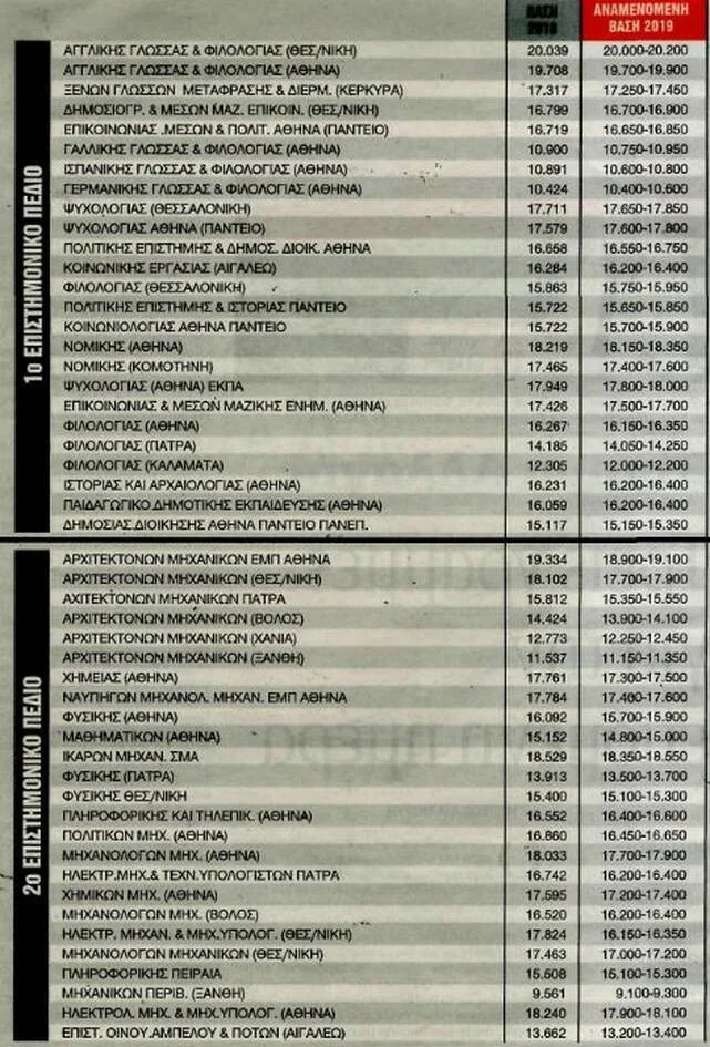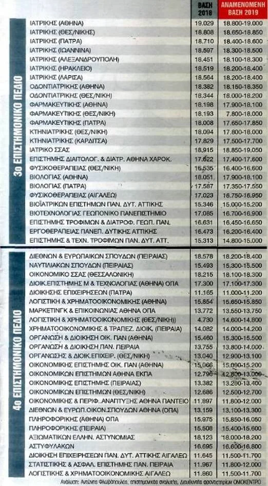 Στο πρώτο επιστημονικό πεδίο οι βάσεις 2019 θα εμφανίσουν ελαφρές αυξομειώσεις και θα κυμανθούν στα επίπεδα του 2018 αλλά στην πλειονότητα θα υπερτερεί το θετικό πρόσημο και όχι το αρνητικό.