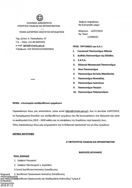 Δείτε το έγγραφο του υφυπουργού Παιδείας, αρμόδιου για τα ΑΕΙ , Βασίλη Διγαλάκη, με το οποίο ζητά από τους Πρυτάνεις δέκα Πανεπιστημίων να του στείλουν , εγγράφως έως τη Δευτέρα 15/07/2019 τα Προγράμματα Σπουδών των νεοϊδρυθέντων τμημάτων που θα λειτουργήσουν στα Ιδρύματά τους κατά το ακαδημαϊκό έτος 2019 – 2020, τις αποφάσεις της Συγκλήτου περί έγκρισής τους και τον αριθμό διδακτικού προσωπικού αυτών των τμημάτων.