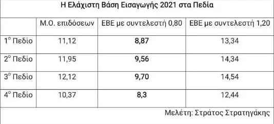 Ο έμπειρος αναλυτής «χτένισε» τους μέσους όρους όλων των μαθημάτων κάθε πεδίου και υπολόγισε με αυτόν τον τρόπο τον μέσο όρο κάθε πεδίου. «Αυτός ο μέσος όρος πολλαπλασιάζεται με έναν συντελεστή, που έχουν ορίσει τα τμήματα, που έχει εύρος από 0,8 έως 1,2, σύμφωνα με απόφαση του υπουργείου Παιδείας. Έτσι ο ελάχιστος μέσος όρος που πρέπει να έχει ο υποψήφιος στα 4 μαθήματα, χωρίς συντελεστές βαρύτητας, για να μπορεί να δηλώσει έστω και λίγες σχολές, είναι το 8,3», προσθέτει.