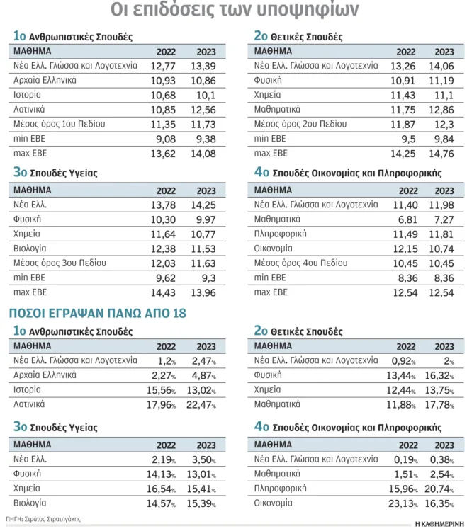 Με βάση την επεξεργασία των στοιχείων των βαθμολογικών επιδόσεων από τον μαθηματικό – αναλυτή κ. Στράτο Στρατηγάκη ανά επιστημονικό πεδίο προβλέπονται τα εξής: