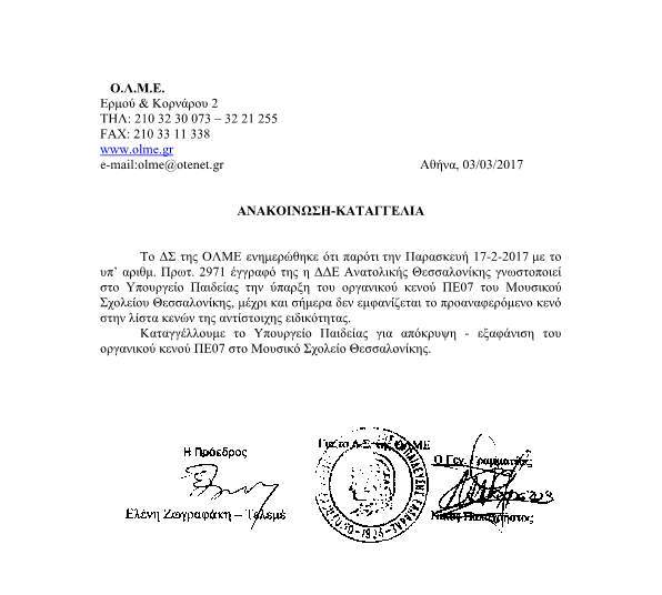 Ανακοίνωση-Καταγγελία για την απόκρυψη οργανικού κενού