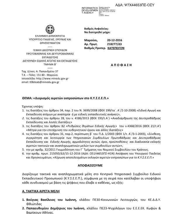 Συγκρότηση του Περιφερειακού Υπηρεσιακού Συμβουλίου Ειδικού Εκπαιδευτικού Προσωπικού (Π.Υ.Σ.Ε.Ε.Π.) Κρήτης…Ορισμός σειράς εκλογής και Διορισμός τακτικών και αναπληρωματικών αιρετών μελών του Π.Υ.Σ.Ε.Ε.Π. Κρήτης