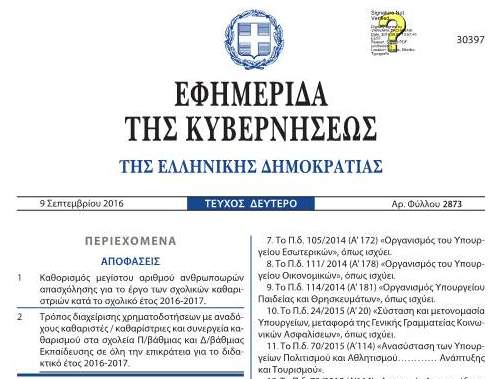 ΦΕΚ-2873 Β/9-9-16 :Κ.Υ.Α. 144807/16 : Τρόπος διαχείρισης χρηματοδοτήσεων με αναδόχους καθαριστές / καθαρίστριες και συνεργεία καθαρισμού στα σχολεία Π/βάθμιας και Δ/βάθμιας Εκπαίδευσης σε όλη την επικράτεια για το διδακτικό έτος...