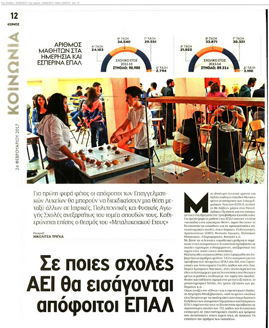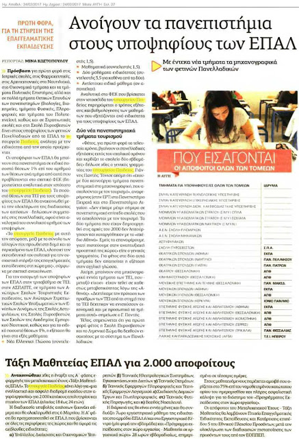 ΜΑΘΗΤΕΙΑ ΕΠΑΛ ΑΙΤΗΣΕΙΣ Η υποβολή αιτήσεων ξεκίνησε στις 24 Φεβρουαρίου 2017 και θα ολοκληρωθεί στις 6 Μαρτίου 2017. Η Α’ φάση θα πραγματοποιηθεί σε ΕΠΑ.Λ που βρίσκονται σε όλες...