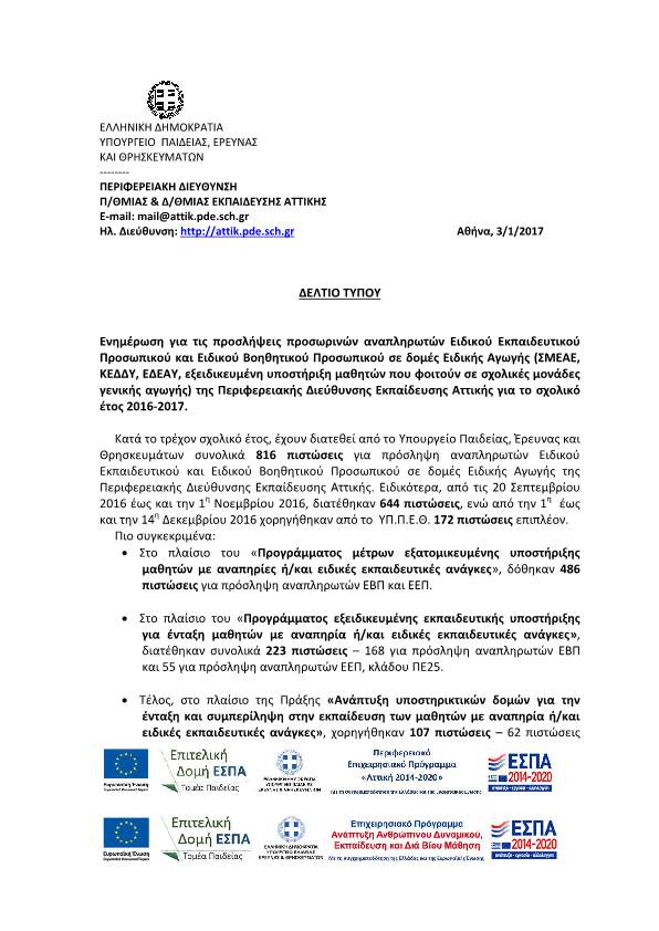 ΕΛΛΗΝΙΚΗ ΔΗΜΟΚΡΑΤΙΑ ΥΠΟΥΡΓΕΙΟ ΠΑΙΔΕΙΑΣ ΕΡΕΥΝΑΣ ΚΑΙ ΘΡΗΣΚΕΥΜΑΤΩΝ ΠΕΡΙΦΕΡΕΙΑΚΗ Δ/ΝΣΗ Α/ΘΜΙΑΣ ΚΑΙ Β/ΘΜΙΑΣ ΕΚΠ/ΣΗΣ ΚΡΗΤΗΣ Τριπολιτάκης Κωνσταντίνος Σχολικός Σύμβουλος 16ης & 15ης Περιφέρειας Ε.Α.Ε. Κρήτης-Βορείου Αιγαίου Ηράκλειο, 22/12/2016 Αρ. Πρωτ.: 646...