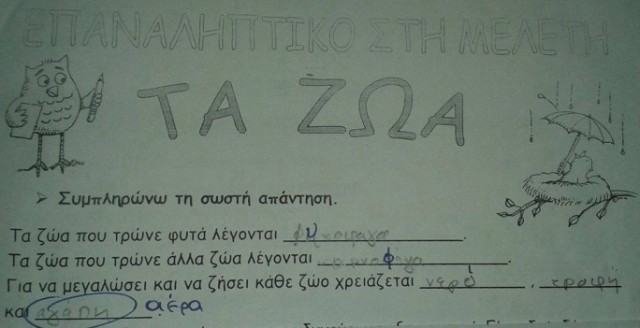 Στο επαναληπτικό τεστ της Μελέτης με θέμα τα ζώα, στην ερώτηση «Για να μεγαλώσει και να ζήσει κάθε ζώο χρειάζεται…», μια 7χρονη μαθήτρια συμπλήρωσε «νερό, τροφή και αγάπη»! Ο δάσκαλος...