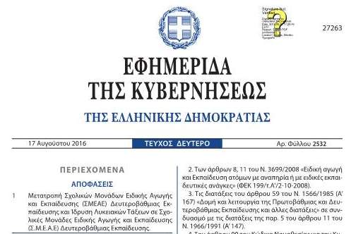 «Ιδρύσεις Σχολικών Μονάδων Ειδικής Αγωγής και Εκπαίδευσης (ΣΜΕΑΕ) Δευτεροβάθμιας Εκπαίδευσης» Μετατροπή Σχολικών Μονάδων Ειδικής Αγωγής και Εκπαίδευσης (ΣΜΕΑΕ) Δευτεροβάθμιας Εκπαίδευσης και Ίδρυση Λυκειακών Τάξεων σε Σχολικές Μονάδες Ειδικής Αγωγής και...