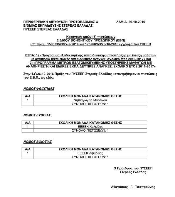 Π.Δ.Ε. ΣΤΕΡΕΑΣ ΕΛΛΑΔΑΣ: ΚΑΤΑΝΟΜΗ 53 ΠΙΣΤΩΣΕΩΝ Ε.Ε.Π. ΣΕ Σ.Μ.Ε.Α.Ε. – ΚΕ.Δ.Δ.Υ. – Ε.Δ.Ε.Α.Υ. ΓΙΑ ΤΟ 2016-17 ΔΕΙΤΕ ΕΔΩ