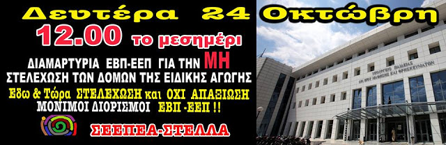 ΠΡΟΚΗΡΥΞΗ ΣΤΑΣΗΣ ΕΡΓΑΣΙΑΣ Η Π.Ο.Σ.Ε.Ε.Π.Ε.Α. προκηρύσσει τρίωρη στάση εργασίας (11:00-14:00) τη Δευτέρα 24 Οκτωβρίου, για να μπορέσουν οι εργαζόμενοι συνάδελφοι να υποστηρίξουν την παράσταση διαμαρτυρίας των αναπληρωτών Ειδικού Εκπαιδευτικού και...