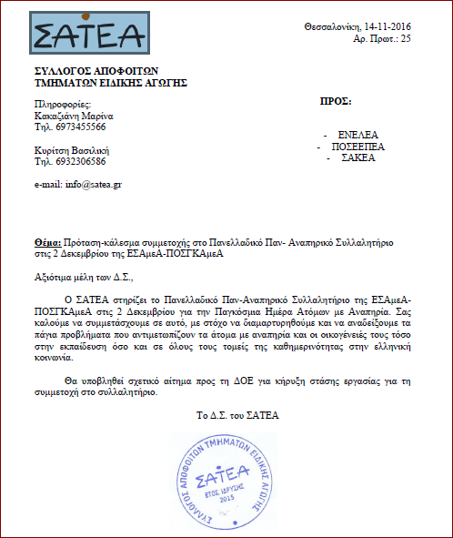 ΤΟ ΠΑΝΕΛΛΑΔΙΚΟ ΣΥΛΛΑΛΗΤΗΡΙΟ ΤΩΝ ΑΤΟΜΩΝ ΜΕ ΑΝΑΠΗΡΙΑ ΤΗΣ ΠΑΡΑΣΚΕΥΗΣ 2/12/2016