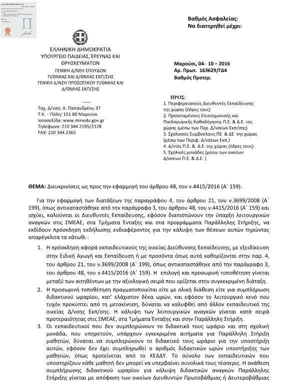 05-10-16 Διευκρινίσεις ως προς την εφαρμογή του άρθρου 48, του ν.4415/2016 (Α ́ 159) Για την εφαρμογή των διατάξεων της παραγράφου 4, του άρθρου 21, του ν.3699/2008 (Α ́199), όπως...